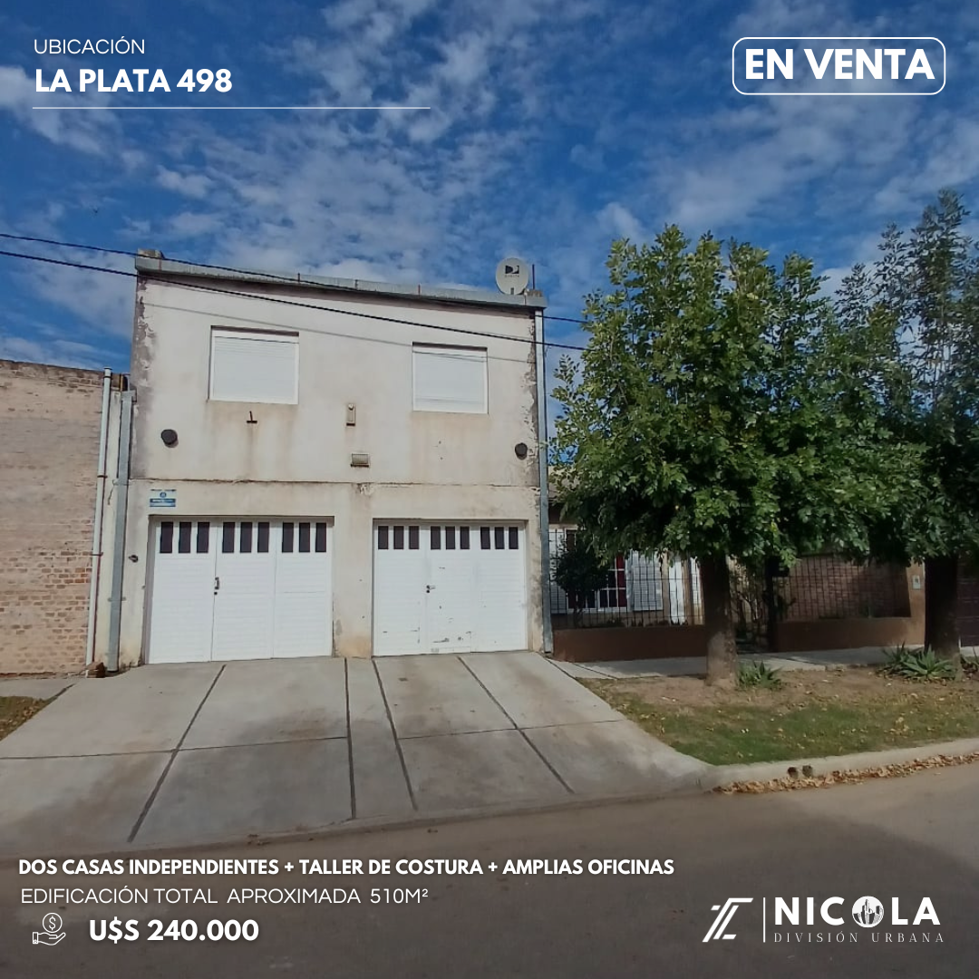 Características: La misma esta sobre unos 547m² de terreno y cuya edificación total asciende a 510m² y cuenta con 2 casas independientes una de la otra + un taller de costura con amplias oficinas, una de las casas que tiene frente sobre calle La Plata, cuenta con cocina, living comedor, 3 habitaciones, lavadero y garaje. La misma tiene unos 85m² aproximados de muy buena calidad constructiva y muy bien cuidada.