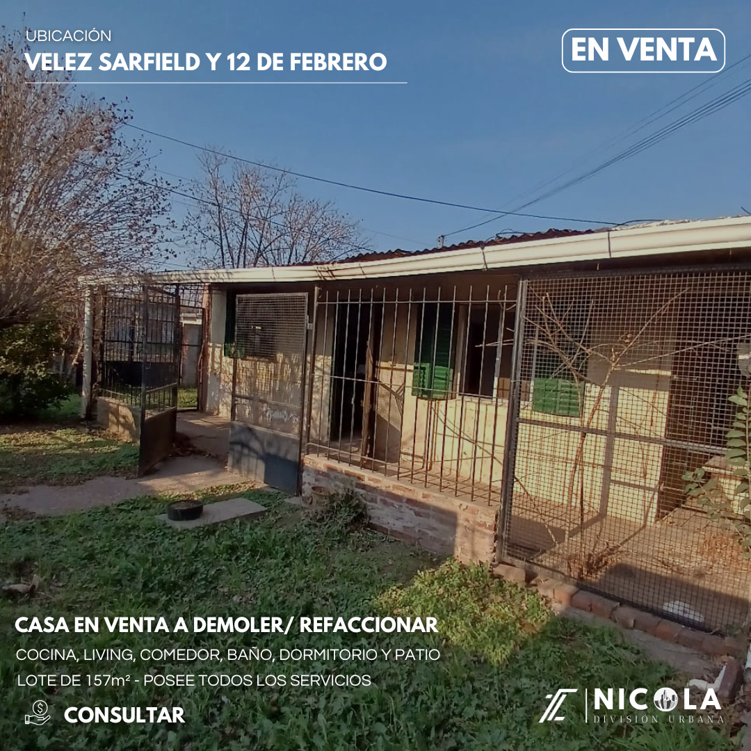 Características: Propiedad compuesta por casa a demoler/ refaccionar con patio, en la intersección de las calles 12 de Febrero y Velez Sarfield, una zona muy linda y tranquila de la ciudad. La casa se compone de cocina, living, comedor, baño y dormitorio. Sobre lote de unos 157m², posee todos los servicios.