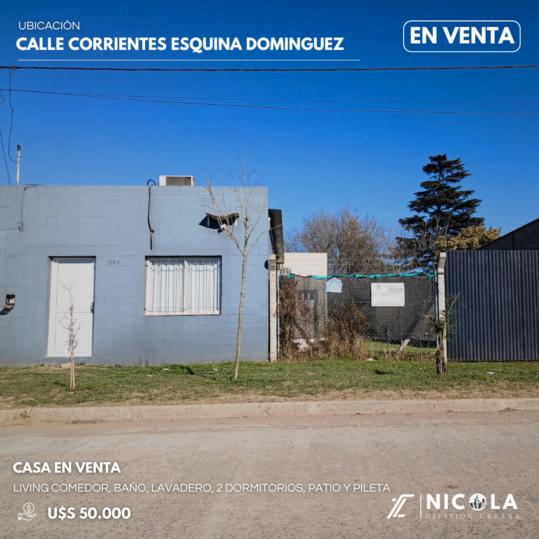 CASA EN VENTA Ubicación: Corrientes casi esquina Dominguez Características: Casa compuesta por living comedor, baño, lavadero, 2 habitaciones y amplio pasillo, patio grande con pileta de 7x3. Sobre lote de 430m2 cuenta con los servicios de agua, luz, cloacas, asfalto y el gas natural pasa por la vereda. Precio: U$S 50.000